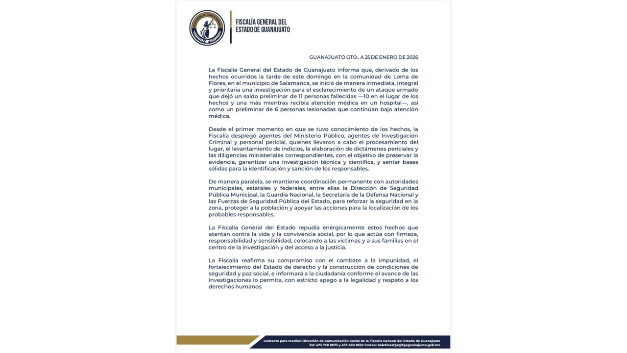 La Fiscalía General del Estado de Guanajuato informa que, derivado de los hechos ocurridos la tarde de este domingo en la comunidad de Loma de Flores, en el municipio de Salamanca, se inició de manera inmediata, integral y prioritaria una investigación para el esclarecimiento de un ataque armado que dejó un saldo preliminar de 11 personas fallecidas —10 en el lugar de los hechos y una más mientras recibía atención médica en un hospital—, así como un preliminar de 6 personas lesionadas que continúan bajo atención médica.
